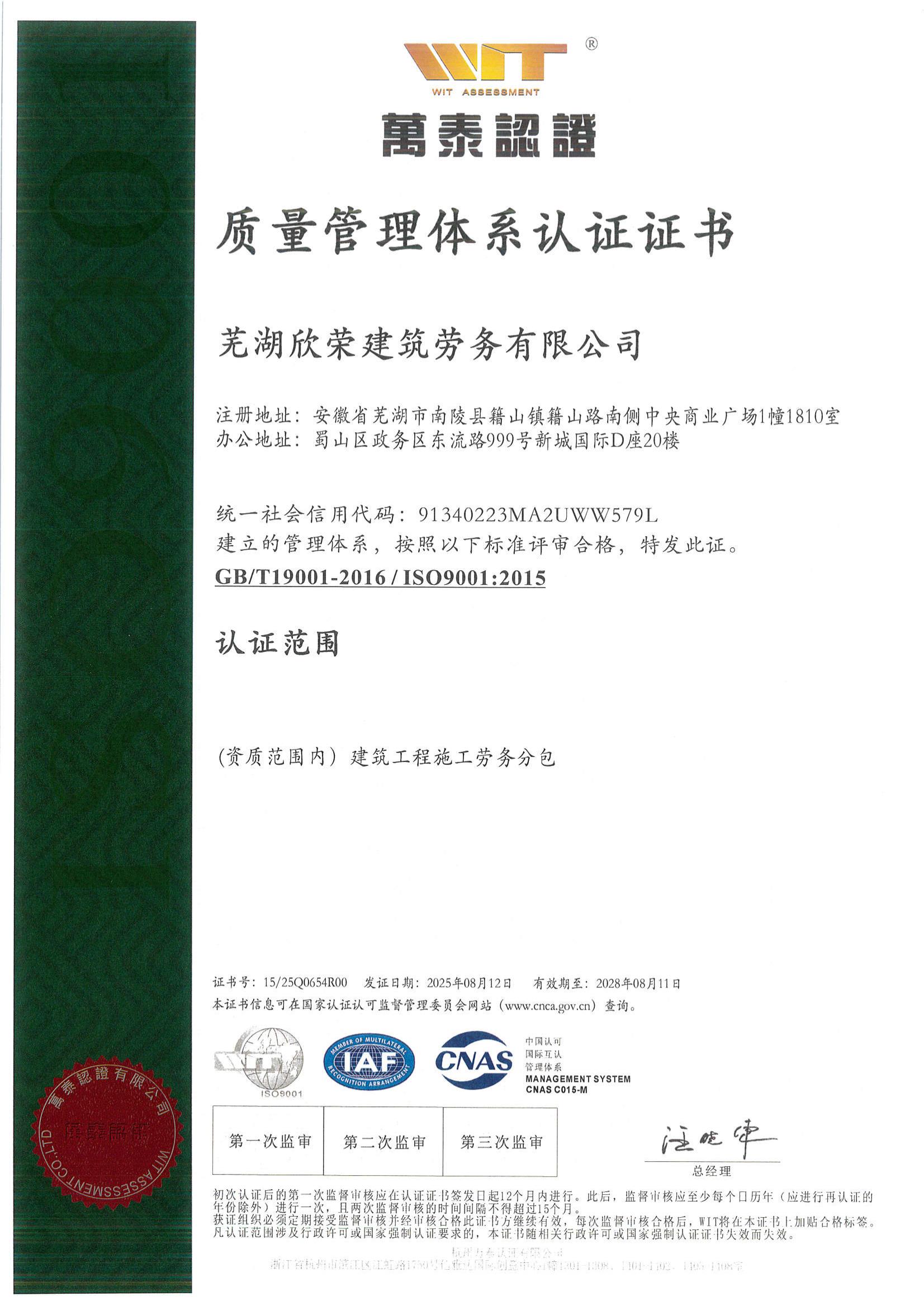 • 欣荣劳务获“质量管理…
